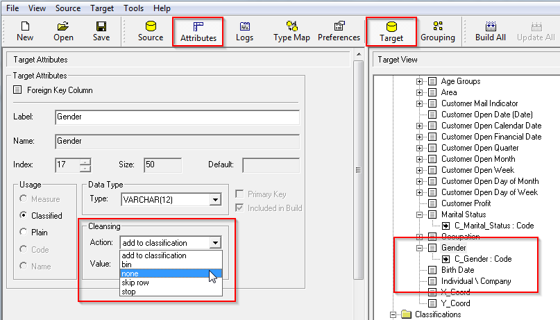 In the Target Attributes, select the Action from the Cleansing drop-down list.
