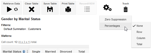 Some of the percentage options are not available for certain types of table. For example, the Total percentage option is not available when the table contains multiple summation options.
