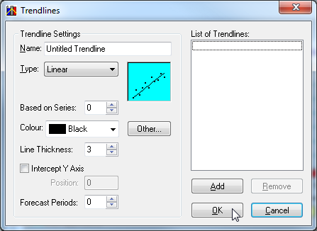 Order (Only applicable to Polynomial). The order of the polynomial. This can be any value between 2 and 10 inclusive. Period (Only applicable to Moving Average). The number of periods that the moving average trendline is based on. This can be any value between 2 and 10 inclusive. Based on Series The series that the trendline will be based on. The value depends on the number of series in the currently selected chart layer. Series are zero based, therefore, the first series is 0. Colour The colour of the trendline. Line Thickness The thickness of the trendline. This can be any value between 1 and 30. Intercept Y Axis Select this check box to allow the line to intercept with the y-axis. Not available for Logarithmic, Power and Moving Average trendlines. Position A point on the y-axis indicating the exact position where the trendline must intercept the y-axis. Forecast Periods The number of extra periods to forecast in the trendline. This can be any value between 1 and 30. - When you have finished configuring the settings, click Add to add the trendline to the list.