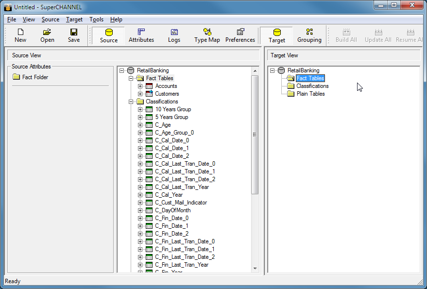 SuperCHANNEL connects to your source database and displays the tables and columns in the Source View pane: