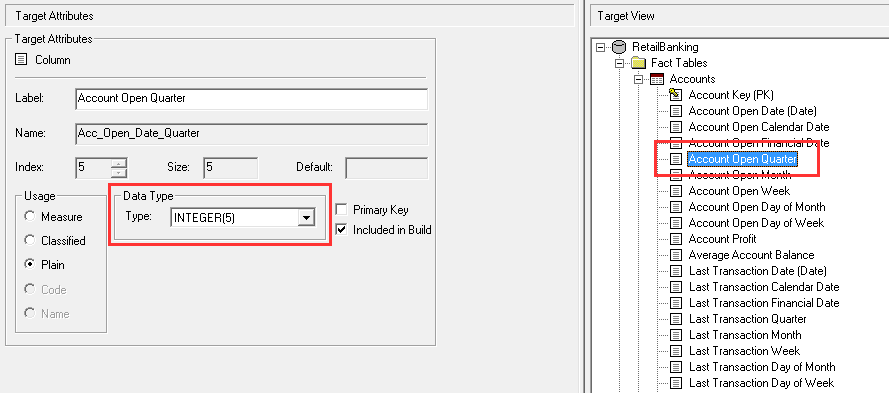 For example, the Customer table has a column containing the customer's date of birth. To include this in the build, select the column in the Target View, then select the Included in Build check box and the Plain usage type: