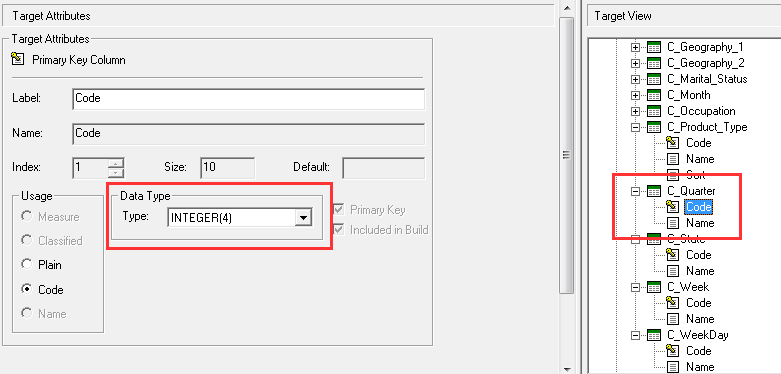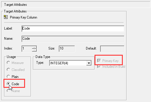 In the Target Attributes section, select the Primary Key checkbox and set the Usage to Code.