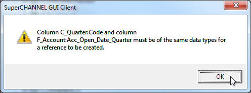 This message indicates that there is a mismatch between the data type of the column in the fact table and the primary key of the classification table.