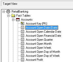 Fact Table Fact Table Column Create Reference to the Primary Key of... Accounts Account Open Calendar Date C_Cal_Date_0 Accounts Account Open Financial Date C_Fin_Date_0 Accounts Account Open Quarter C_Quarter Accounts Account Open Month C_Month Accounts Account Open Week C_Week Accounts Account Open Day of Month C_DayOfMonth Accounts Account Open Day of Week C_WeekDay Accounts Last Transaction Calendar Date C_Cal_Last_Tran_Date_0 Accounts Last Transaction Financial Date C_Fin_Last_Tran_Date_0 Accounts Last Transaction Quarter C_Quarter Accounts Last Transaction Month C_Month Accounts Last Transaction Week C_Week Accounts Last Transaction Day of Month C_DayOfMonth Accounts Last Transaction Day of Week C_WeekDay Accounts Product Type C_Product_Type Customers Age C_Age Customers Age Groups C_Age_Group_0 Customers Area C_Geography_0 Customers Customer Mail Indicator C_Cust_Mail_Indicator Customers Customer Open Calendar Date C_Cal_Date_0 Customers Customer Open Financial Date C_Fin_Date_0 Customers Customer Open Quarter C_Quarter Customers Customer Open Month C_Month Customers Customer Open Week C_Week Customers Customer Open Day of Month C_DayOfMonth Customers Customer Open Day of Week C_WeekDay Customers Gender C_Gender Customers Marital Status C_Marital_Status Customers Occupation C_Occupation Some of these columns contain hierarchical data. For example, Area contains a hierarchy of states, cities, suburbs, and postcodes.