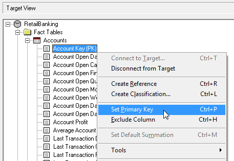 Right-click the primary key in the Target View and select Set Primary Key. In this example the columns have been named according to the recommended naming convention, so it is easy to identify which ones need to be set as the primary key, because they have (PK) in the column name.