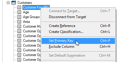 It is also necessary to define the primary keys for each fact table. Right-click the column you want to set as the primary key and select Set Primary Key.