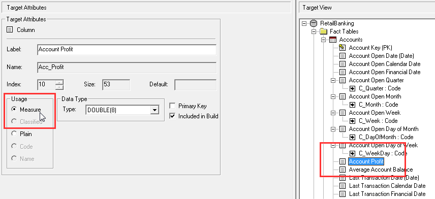 To define a measure, select a column in the Target View and then set the Usage to Measure in the Target Attributes.