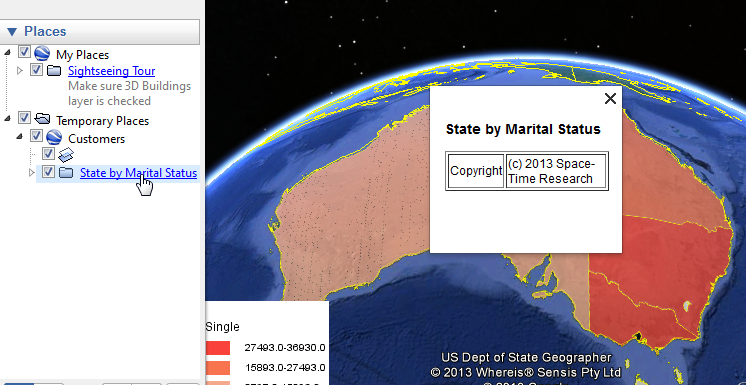 By default, SuperWEB2 will include the table name in the file (this will appear in the layer list in Google Earth) and a legend for the map (this displays in the bottom left corner of the display in Google Earth).