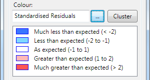 Standardised Residuals | Shows colours based on the standardised measure of deviation from the expected values (this is the default colour setting). |