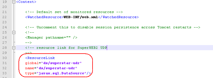 </Context>tag:XML<ResourceLink global="ds/superstar-udr" name="ds/superstar-udr" type="javax.sql.DataSource"/>