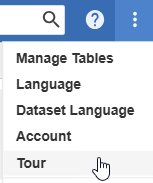 The tour is automatically shown on a user's first login. By default, users can access the tour again by selecting the Tour option from the menu at the top-right of SuperWEB2: