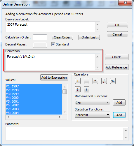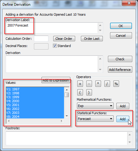 The Define Derivation window displays.In Derivation Label, enter a suitable name for the derivation, such as 2007 Forecast (this will display in the column heading).