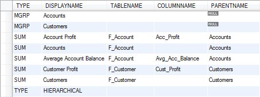 COLUMNNAME | string | 128 | YES | The name of the fact table column for this field. Only required for classification or summation fields (i.e., not groups). | ||||||||||||||||||