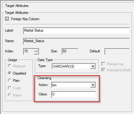 In the example shown here, the message indicates that in row 269192 of the fact table, SuperCHANNEL found a value of ' ' (i.e., an empty value) in the Marital_Status column. As this is not one of the valid classifications for this column, it has automatically been binned to 'U' (Unknown).