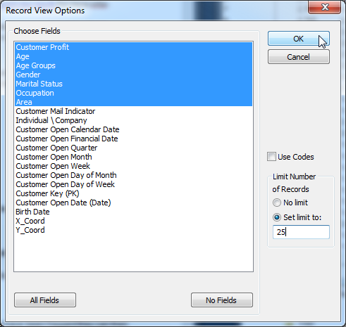 3. The Record View Options window displays, with a list of fields in the primary fact table.