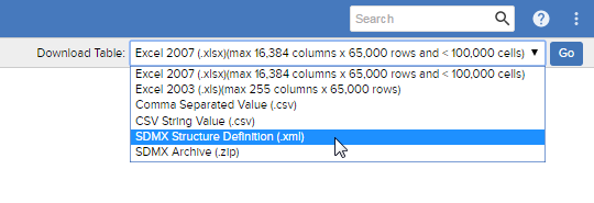 SuperWEB2 users can download data from Table View in a variety of formats, including SDMX (Statistical Data and Metadata eXchange) Version 2.0: