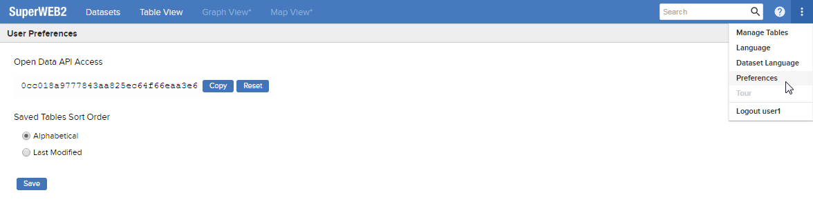 By default, users have access to a preferences page where they can select their preferred sort order for Saved Tables (this page also displays their Open Data API key, if they have access to the API):