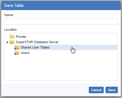 The display name for this folder has been set to Shared User Tables. This display name will appear in SuperWEB2 when users are saving and loading tables and custom data from this folder. For example: