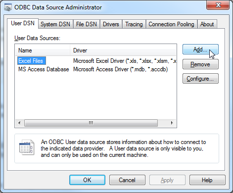 Once you have installed the drivers, go to the Windows Control Panel and select System and Security > Administrative Tools > Data Sources (ODBC).