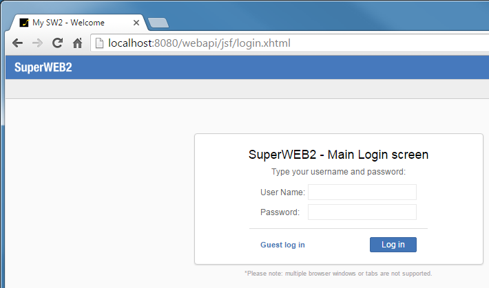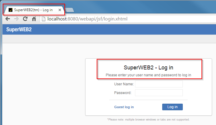 You can modify most of the text that appears in SuperWEB2 to suit your requirements. This section demonstrates just one example by showing how to change the labels that appear in the browser/tab title and on the login screen: