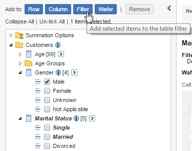 As shown here, you can add multiple filters to a table, and only records matching all of the filters will be included in the table. However, you can only add one field item from any given field (for example you cannot add Gender - Male and Gender - Female at the same time).