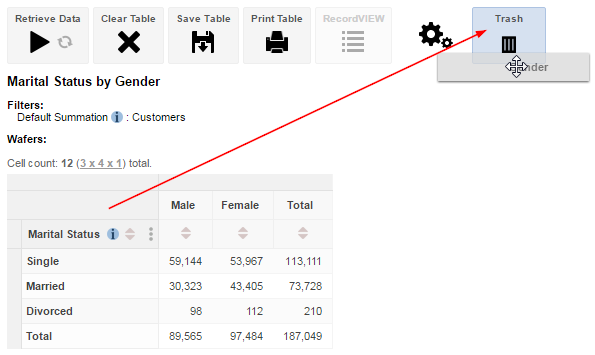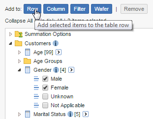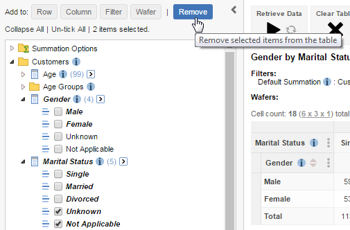 To create or update a table, select the fields you want from the list and add them to either the table rows, columns, wafers, or filters. For example (using the sample Retail Banking dataset), suppose we want to create a table with Gender in the rows and Marital Status in the columns: