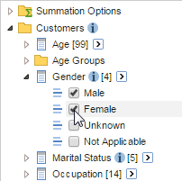 Suppose we have decided that we do not want to include all the values of the Marital Status field in the table. We can use the tree on the left to remove individual field values.