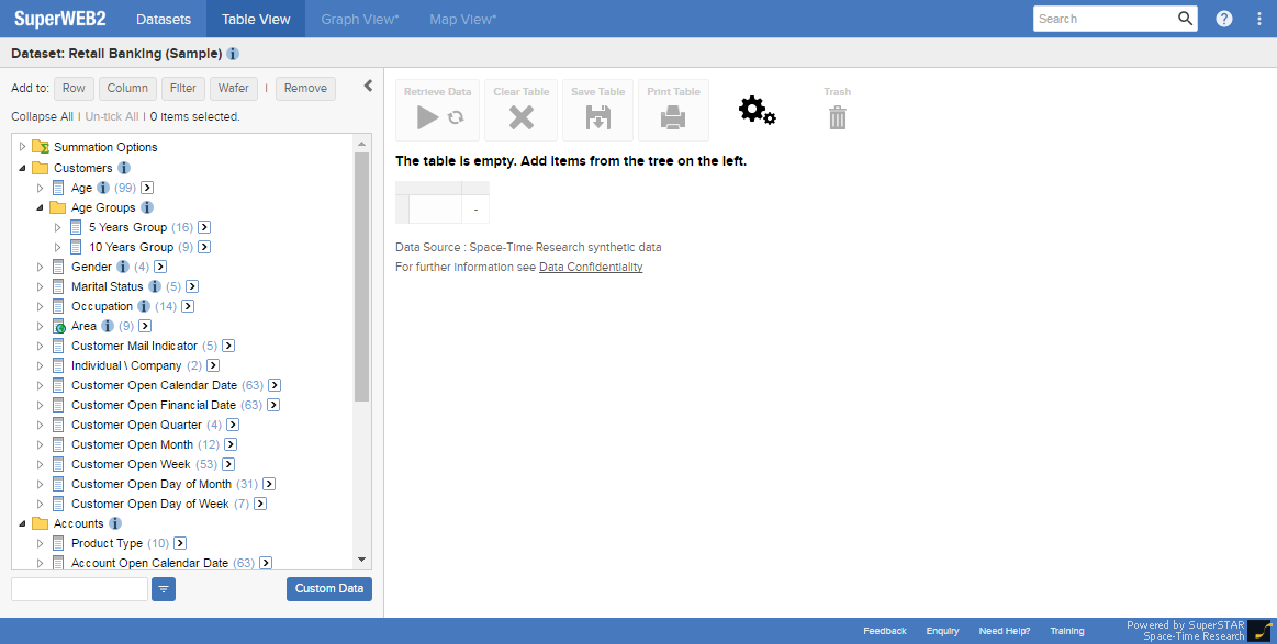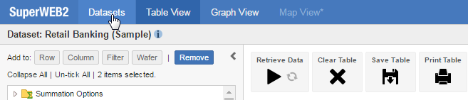 When you add the first field values to the table, SuperWEB2 also adds the default summation, so that your table has something to measure. Typically the default summation will be something like a count. For Retail Banking the default summation option is to count the number of customers.