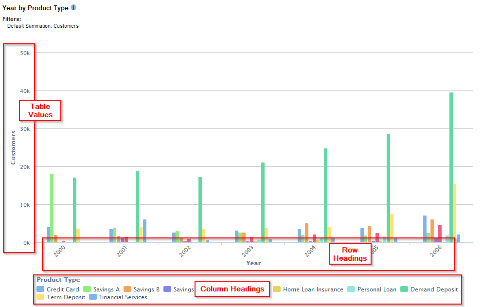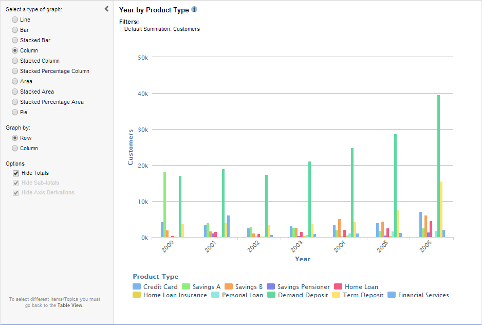 For example, the following table shows the number of customers holding different banking products between 2000 and 2006: