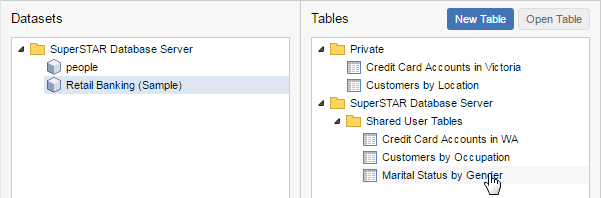 To open your saved table, click the dataset it was created from, then go to the Tables list and double-click the table name. For example: