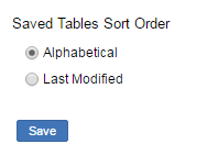 Choose between Alphabetical (tables will be displayed in ascending alphabetical order) or Last Modified (the most recently modified/created tables will appear at the top of the list).