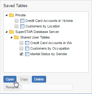 Tables saved by users in SuperWEB2 are typically private (only visible and accessible to the user who created the table). Depending on how your administrator has configured SuperWEB2, you may also be able to load and save shared tables, which are accessible to multiple SuperWEB2 users.