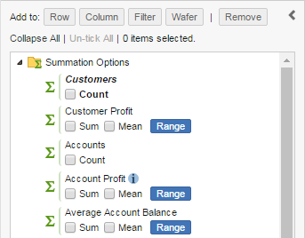 The available summation options are shown at the top of the tree in the customise table panel. Select an option and then click Add to Row, Column, Filter or Wafer to add it to the table.