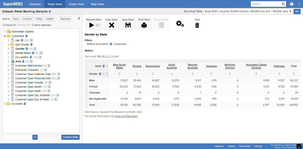 Once you have logged in, simply select the fields you are interested in and drag and drop to build your first table. Then you can run the query to get the data from the SuperSTAR database, and visualise the results using a graph or on a map. All you need to get started is your web browser.